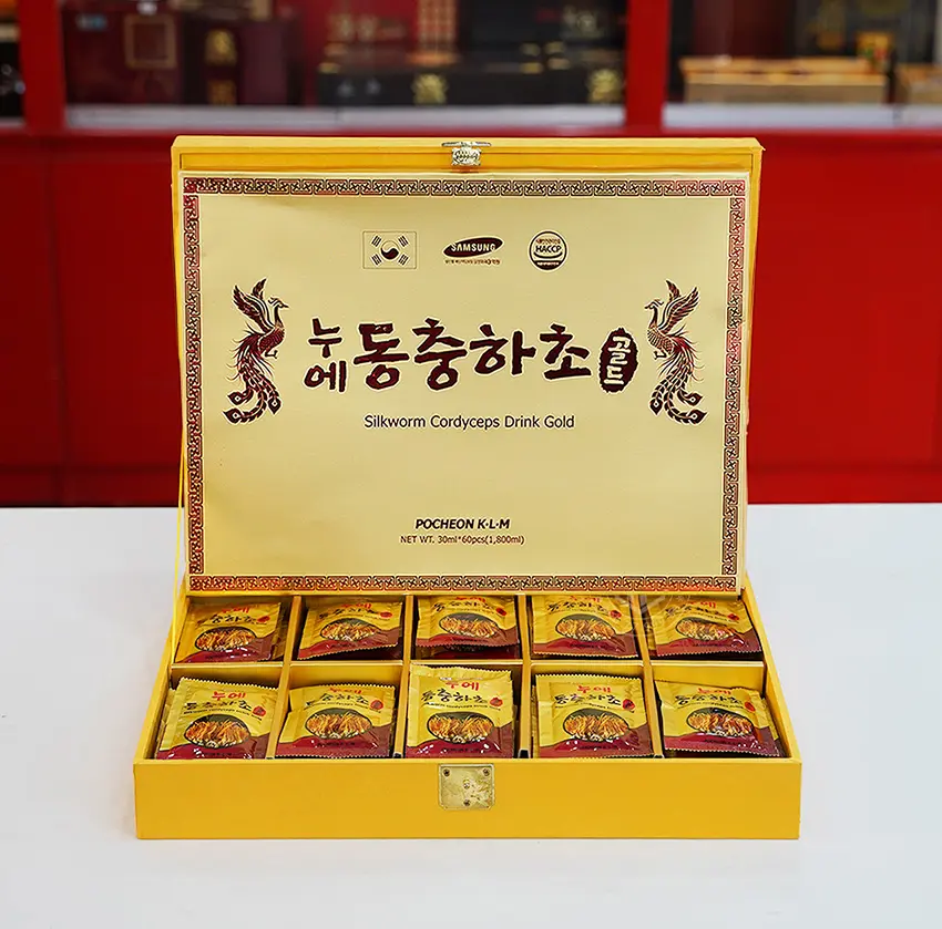 - Ngoài ra, hộp vàng 60 gói nước đông trùng hạ thảo Hàn Quốc có thiết kế đóng hộp sang trọng và dạng gói tiện lợi. Đây là món quà có giá trị đặc biệt, thích hợp để tặng cho người thân trong các dịp lễ tết, mang theo ý nghĩa đặc biệt.