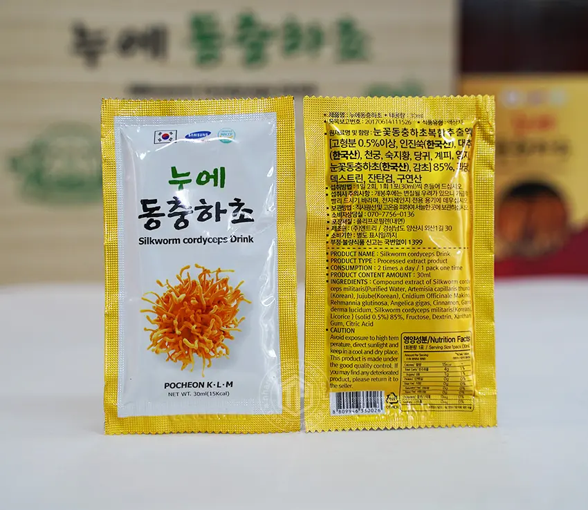 Chiết xuất đông trùng hạ thảo (Dong chung ha cho, vegetable worms) 85 % trong đó thành phần rắn chiếm 0,5%. táo tàu (Hàn Quốc), cnidium officinalis, địa hoàng, đương quy, quế, linh chi, Cordyceps sinensis (Hàn Quốc), cam thảo ....